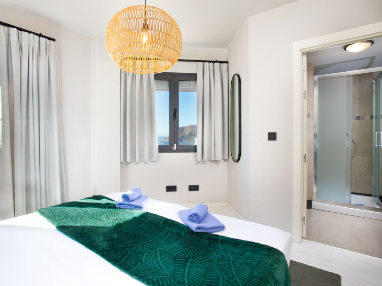 "Bahia", 5-Zimmer-Doppelhaushälfte 227 m2, Südlage. Geräumig und hell, komfortabel und schön eingerichtet: Wohn-/Esszimmer mit Digital-TV, Klimaanlage und Warmluftheizung. Ausgang zur Terrasse, Pergola. Küche (Backofen, Geschirrspüler, 4 Glaskeramikplatten, Toaster, Wasserkocher, Mikrowelle, Tiefkühler, elektrische Kaffeemaschine). Ausgang zur Terrasse. Sep. WC. Obergeschoss: 1 Zimmer mit 1 x 2 Etagenbetten (90 cm, Länge 190 cm), Klimaanlage und Warmluftheizung. Ausgang zum Balkon. 1 Zimmer mit 1 Doppelbett (180 cm, Länge 200 cm), Bad/WC, Klimaanlage und Warmluftheizung. 1 Zimmer mit 1 Doppelbett (160 cm, Länge 200 cm), Dusche/WC, Klimaanlage und Warmluftheizung. Ausgang zum Balkon. Dusche/WC. 2. Obergeschoss: 1 abgeschrägtes grosses Zimmer mit 1 Doppelbett (200 cm, Länge 200 cm), Digital-TV, Klimaanlage und Warmluftheizung. Ausgang zur Terrasse. Laube. Terrassenmöbel, Gartengrill. Panoramasicht auf das Meer und die Landschaft. Zur Verfügung: Waschmaschine, Bügeleisen, Kinderhochstuhl, Babybett, Haartrockner. Internet (WLAN, gratis). VUT/GR/06866 // Reg. Nr.: ESFCTU0000180160006597580000000000000000VUT/GR/068668