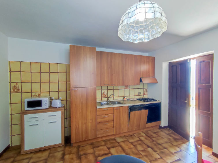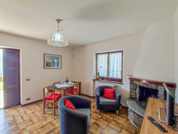 Appartement 2-kamers 50 m2, op de begane grond. Doelmatig ingericht: woon-/eetkamer met open haard, eettafel en Sat-TV. Uitgang naar het terras. 1 2-pers. kamer. Open keuken (oven, afwasmachine, Gasfornuis, 4 kookpitten (vlammen), broodrooster, waterkoker, magnetron, elektrische koffiemachine). Uitgang naar het terras. Douche/bidet/WC. Gas-verwarming. Natuurstenen vloeren. Groot terras gedeeltelijk overdekt, zithoek in de tuin. Terrasmeubelen, barbecue, ligstoelen (2). Mooi panoramazicht op het meer, de bergen en het dal. Ter beschikking: kinderstoel, kinderbed tot 2 jaar. Internet (Internet (WiFi), gratis). Privé ingang. IT013218C2EMJLITQD