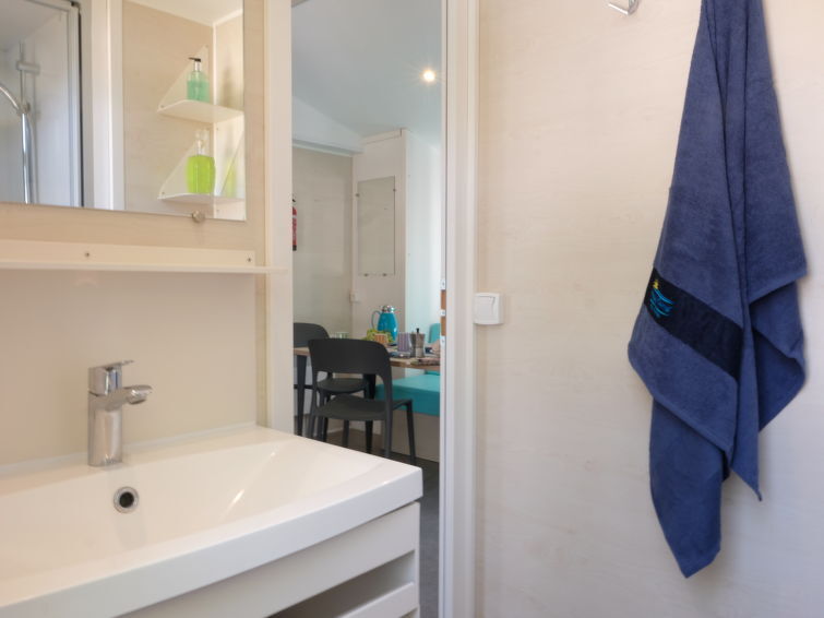 "Happy Premium", 4-kamers mobilhome 30 m2. Comfortabel ingericht: woon-/eetkamer met elektrische verwarming en air-conditioning. 1 kamer met 1 2-pers bed (140 cm, lengte 190 cm). 2 kamers, elke kamer heeft 2 bedden (70 cm, lengte 190 cm). Open keuken (4-pits kookplaat, magnetron, diepvriezer, elektrische koffiemachine). Douche/WC. Air-conditioning. Terras gedeeltelijk overdekt. Terrasmeubelen, elektrische barbecue (verrijdbaar), ligstoelen (2). Ter beschikking: klamboe. Parkeerplaats (1 Auto) bij het huis. Niet rokers woning. IT075097B100029223